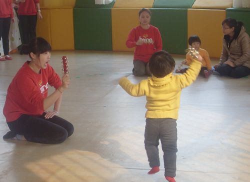 坤寶親子園親子老師搖起小鈴鐺鼓勵小寶寶:真棒!