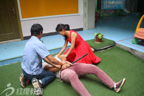 10月19日上午10:00左右,兩名手持武器的“歹徒”(家長扮演)闖進了幼兒園,保安立即上前制止其進入,該歹徒仍繼續進入,警報聲隨即響起。聽到警報聲后,師生立即啟動緊急預案。在教室活動的班級,老師立即關緊門、窗,組織幼兒遠離門窗并找到隱蔽的地方進行躲避。正在操場活動的班級,老師立即組織幼兒緊急撤離到就近的教室和閱覽室,關好門、拉好窗簾躲避,用桌椅等大型物體頂住門,教師立即清點人數,維持好秩序,并安撫幼兒情緒。幼兒園應急小組緊急行動,用警棍、防暴叉等,將“歹徒”摁倒在地上,臨危不亂,竭力保護全園師生安全。